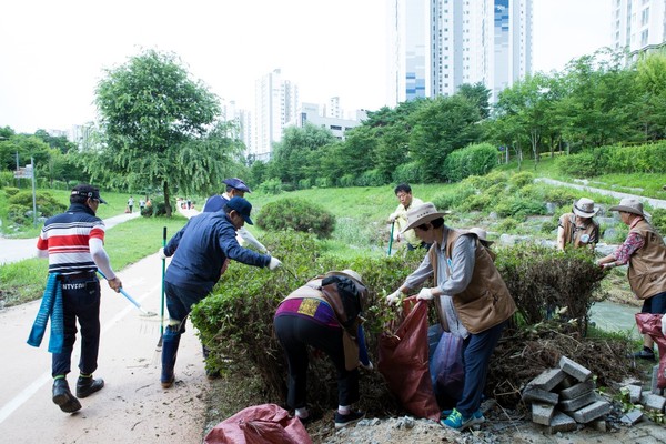 정원친화도시 세종 민간추진연합회(회장 김영제) 회원 300여 명이 25일 어진동, 도담동에 걸쳐있는 방축천 3.5㎞ 구간에서 수해복구 및 환경정화 활동을 전개했다.