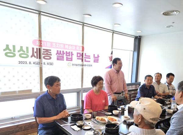 세종특별자치시 최민호 시장은 오는 4일부터 6일까지 열리는 ‘제21회 조치원복숭아축제’ 기간 중 오는 5일 12시 한국 쌀 전업농세종시연합회등과 축제장소 인근 식당 9곳 중 한곳인 세종한우타운에서 김동빈 시의원ㆍ김광운 시의원ㆍ김충식 시의원ㆍ김영현 시의원과 관계자등 30여 명이 점심식사를 같이 한 가운데 ‘싱싱세종 쌀밥 먹는 날’ 쌀소비 캠페인에 나섰다.