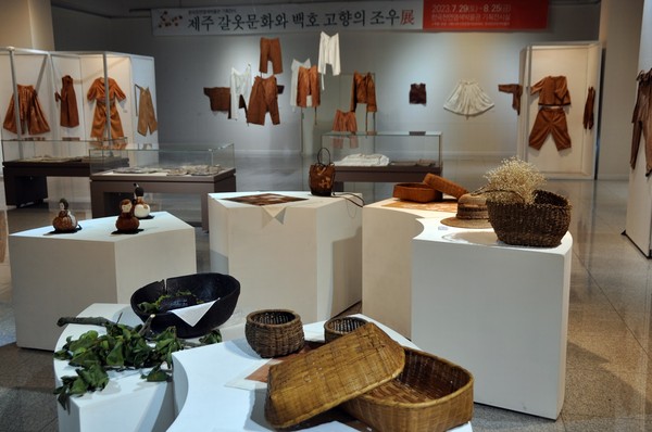 제주도 전통 감물염색에 사용된 도구인 남도구리, 덩드렁마께, 차롱 등 11점도 전시해 감물염색 문화를 시각적으로 느껴볼 수 있다.