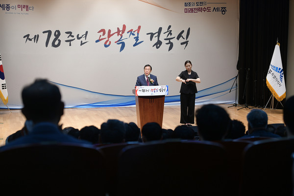 최민호 세종시장이 15일 시청 여민실에서 열린 ‘제78주년 광복절 경축식’에서 “기어이 광복을 이뤄낸 선열들의 용기를 떠올리며 대한민국의 새로운 역사를 창조해 나가자”라고 역설했다.