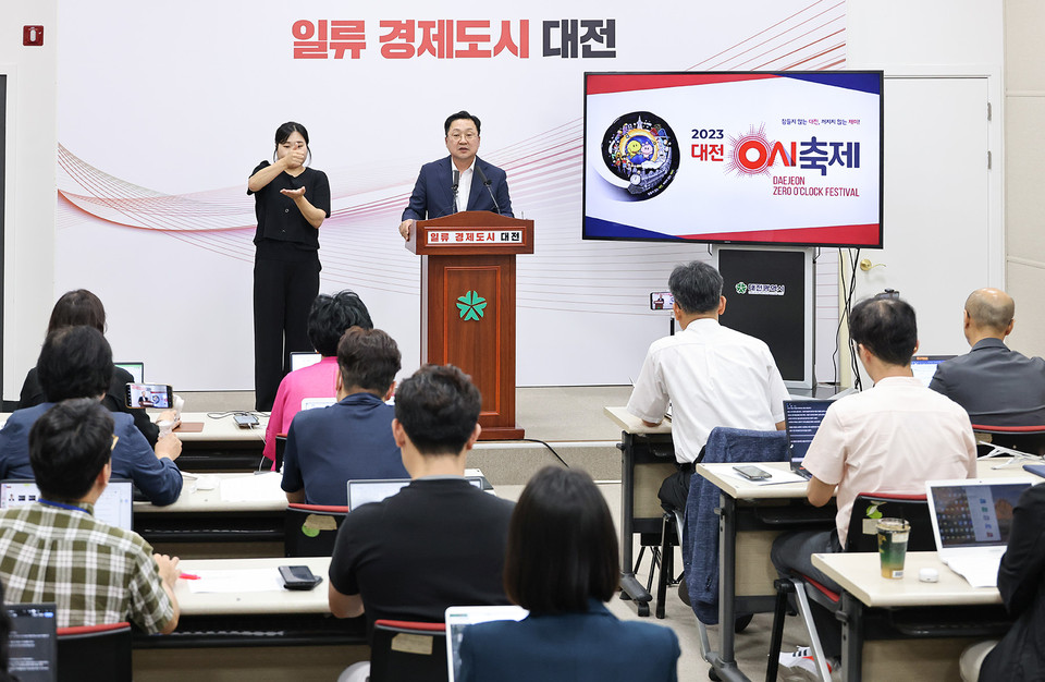 이장우 대전시장은 21일 ‘2023 대전 0시 축제’ 결과 브리핑에서 “미흡한 부분은 더 보완하고 콘텐츠 경쟁력을 강화해 대전 0시 축제를 대전이 가진 재미와 매력을 만끽할 수 있는 세계적인 축제로 키워가겠다”라고 밝혔다.