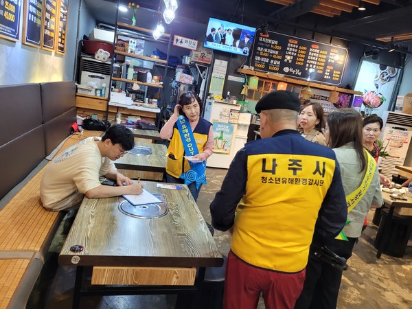 나주시는 추석 명절을 맞이하여 4개 기관(나주시, 경찰서, 교육지원청, 유해환경감시단)과 협력해 유흥주점, 편의점, 노래연습장, PC방 등 청소년 유해환경이 밀집된 빛가람동에서 지난 21일 합동으로 40개 업소 단속을 실시하였다.