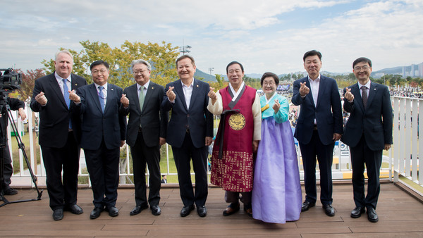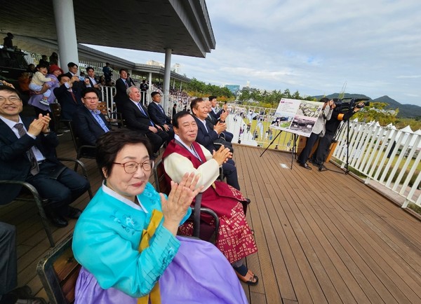 이날 오전11시 세종중앙공원에서 이상민 행안부장관과 최민호 세종시장,전광희 여사,관계공무원 등이 참관한 가운데 헤아릴수 없을 정도의 많은 시민들과 함께 세종시 중앙공원 상공에서 펼쳐지는 '블랙 이글스 에어쇼' 축하 비행을 관람했다.