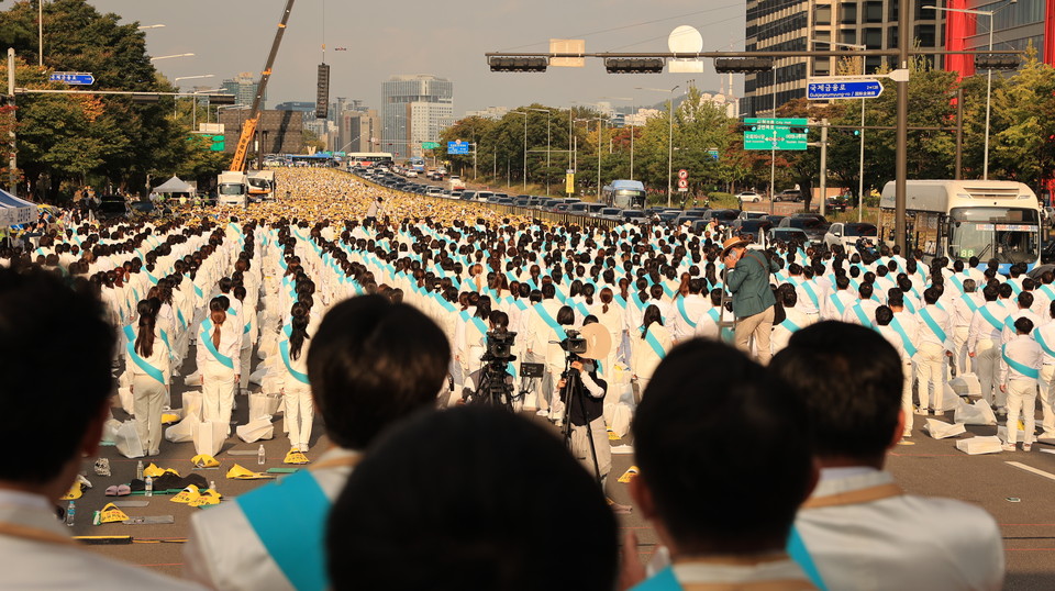 기독교복음선교회(JMS)는 지난 15일 오후 2시부터 4시까지 서울 여의대로에서 ‘2023 민족과 세계를 위한 화합과 평화 구국기도회’를 개최했다. 행사에는 주최 측 추산 국내외 73개국에서 해외 회원 2천여 명을 포함해 전체 20만여 명의 성도가 참여했다.