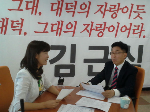 ▲ 김근식(오른쪽) 새누리당 대덕구 국회의원 보궐선거 예비후보가 15일 SJ세종TV '파워인터뷰'에 출연해 정영숙 MC가 이야기 하고 있다.