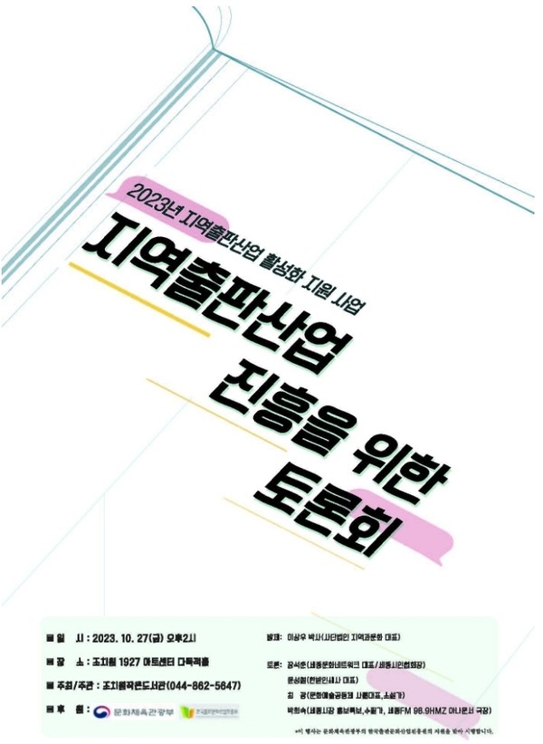 이어서 27일 오후 2시 조치원 1927 아트센터 다목적홀에서는 지역출판산업 진흥을 위한 토론회를 개최한다. 이상우 박사(사단법인 지역과문화 대표)의 발제와 최광(소설가, 시인, 문화예술공동체 사름대표), 장석춘(세종시인협회장), 박희숙(세종시장 홍보특보, 수필가, 세종FM98.9HMZ 아나운서 사무국장), 윤성철(한밭인쇄사 대표), 4명이 토론자로 참여한다.