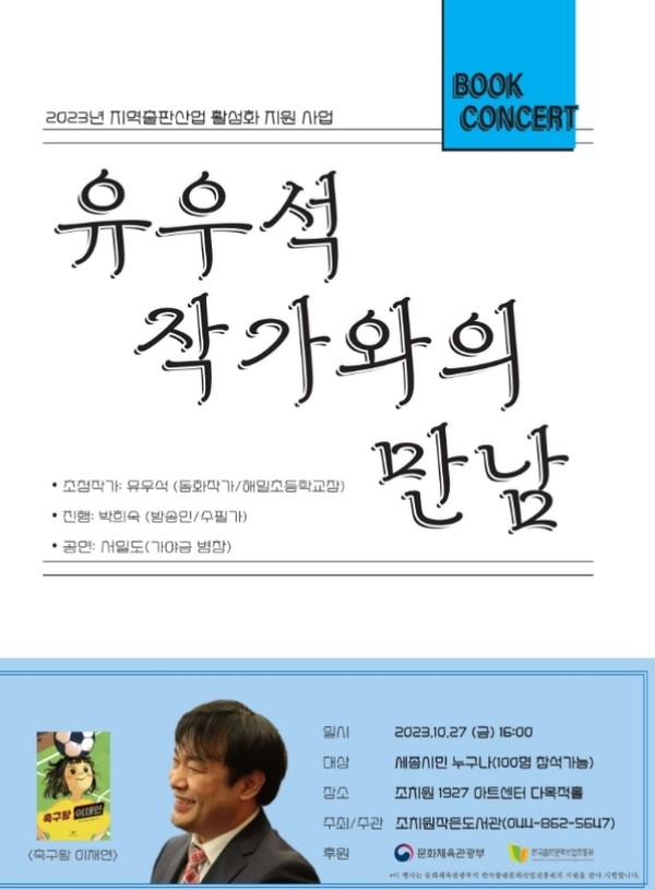 오후 4시에는 같은 장소에서 유우석(아동문학가/해밀초등학교장)작가 초청 북 콘서트를 박희숙 작가의 사회로 진행한다. 유우석 작가의 작품 “축구왕 이채연” 동화를 배경으로 진행되며, 서일도(가야금병창)의 축하 공연도 있다.