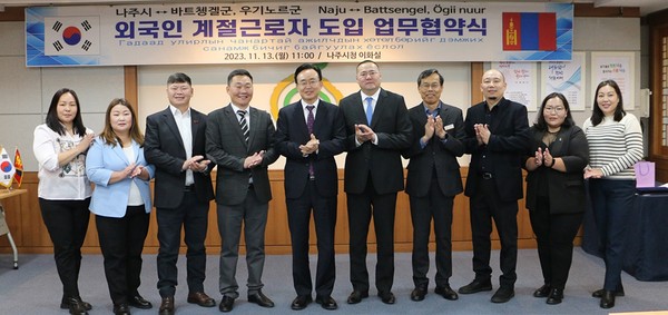 나주시(시장 윤병태)는 13일 시청사 이화실에서 몽골 ‘바트쳉겔’, ‘우기노르’ 군(郡)과 외국인 계절근로자 도입 업무협약을 체결했다고 밝혔다.