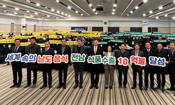 전라남도와 (사)전남농수산식품온라인수출협회는 농수산식품 수출기업·관계자 전진대회를 지난 21일 보성 다비치콘도에서 개최하고, 민선 8기 공약인 2026년 농수산식품 수출 10억 달러 달성 결의를 다졌다.