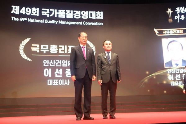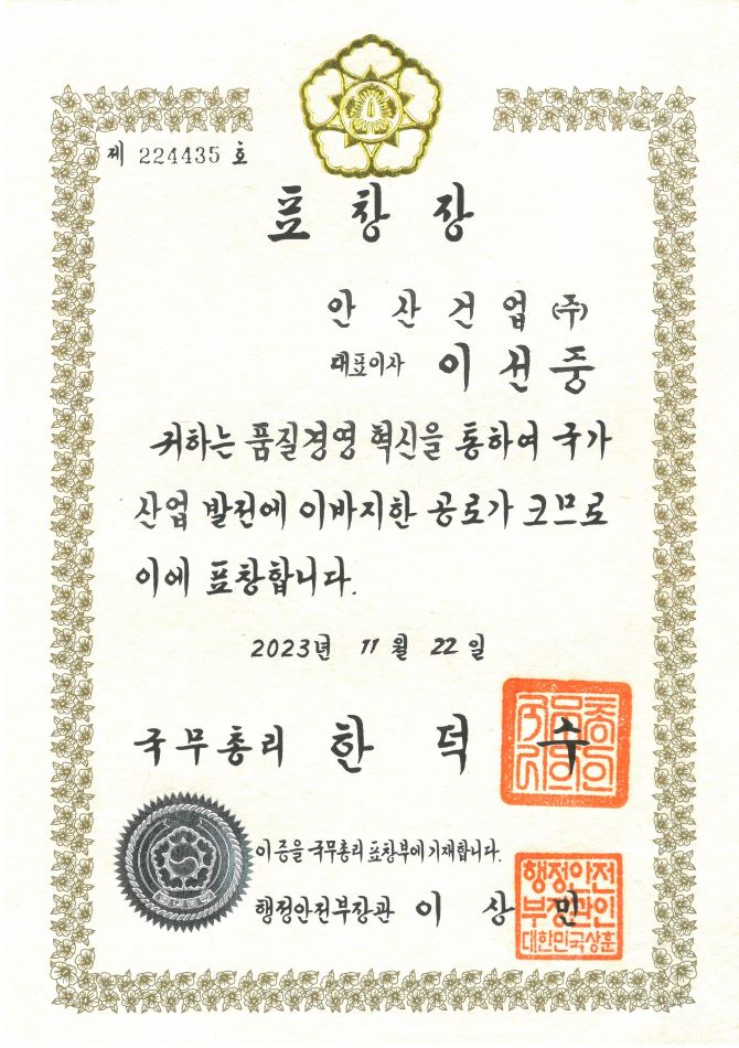 충남에 소재한 안산건업(주)(대표 이선중)이 지난 2023년11월22일 품질경영 혁신을 통해 국가산업 발전에 기여한 공로로 한덕수 총리로부터 국무총리 표창을 수상했다.