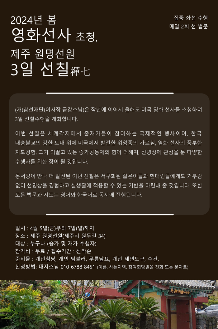 (재)대한불교조계종 참선재단(이사장 금강스님)은 작년에 이어 올해도 미국 위앙종을 이끌고 있는 영화스님을 초청하여 선칠을 개최한다.