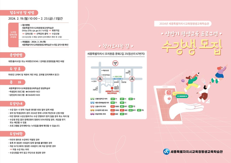 세종시교육청 평생교육학습관(관장 박영신, 이하 평생교육학습관)은 2월 19일부터 2월 23일까지 2024년도 상반기 평생교육 프로그램 수강생을 모집한다.