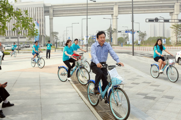 ▲ 이충재 행정중심복합도시건설청장이 20일 '2014 행복청 블로그기자단 워크숍'이 열린 정부세종청사 앞에서 블로그기자단과 행복폭포 등 행복도시 투어를 위해 자전거를 타고 있다. (사진제공=행복청)