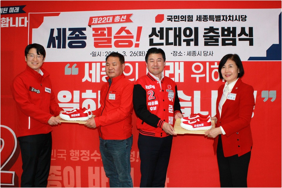 이어서 필승을 다지는 퍼포먼스에서 ‘총선필승! 국민의힘!, 세종이 바뀝니다, 국민의힘으로!’라는 피켓을 들고 필승의 각오를 다졌고 후보들이 지역을 방방곡곡 신발이 닳을 때까지 열심히 뛰어 필승하라는 의미로 ‘국민의힘 운동화’를 전달하는 순서를 가졌다.