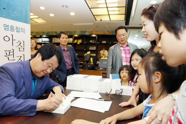 ▲ 22일 오후 2시 30분부터 계룡문고(중구 선화동 소재)에서 열린 '염홍철의 아침편지' 의 저자인 염홍철(왼쪽) 대전시장이 시민들에게 사인을 해주고 있다. 지난 5월 발간된 이 책은 저자가 지난 40여 년 동안의 정치, 행정 경험을 시인의 감수성으로 표현한 것으로 출판기념회 대신 사인회를 가졌다.(사진제공=대전시청)