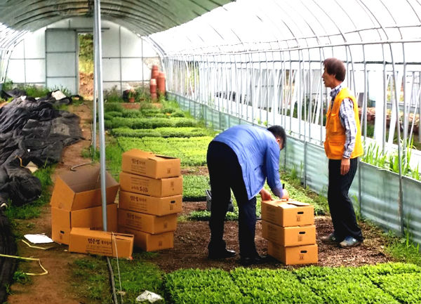 ▲세종시농기센터 직원들이 20일 한 농가에서 4-H가 조직된 학교에 배부할 국화묘를 포장하고 있다.(사진제공=세종시청)