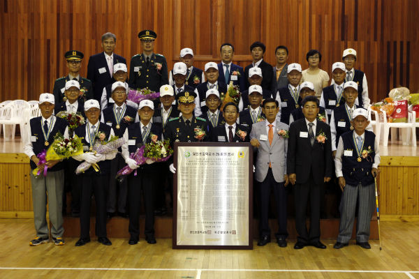 이정기 32사단장이 상희구 교장에게 참전용사 이름이 새겨진 대형명패 전달을 시작으로 박희길 옹(83) 등 17명의 생존 참전용사에게 축소 명패를 증정한 후 군악대 공연, 의장대 시범 관람, 기념촬영, 다과회 순으로 이뤄졌다.