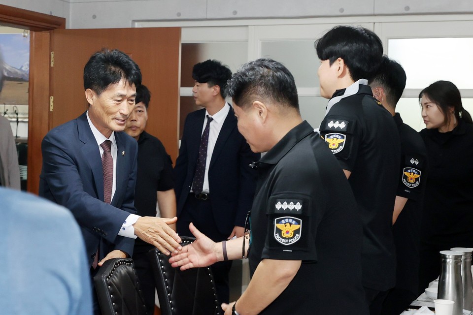 이 의장은 “거듭되는 집중호우와 무더위 속에서 안전한 청사 방호관리를 위해 힘쓰는 청원경찰들의 노고에 깊이 감사드린다”면서 “청원경찰의 복지증진과 처우개선 등을 위해 도의회가 노력하겠다”고 말했다.