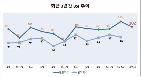 25일 대전상공회의소에 따르면 최근 지역 제조업체 300개사를 대상으로 '2014년 3/4분기 기업경기 전망조사'를 실시한 결과, 기업경기실사지수(BSI ; Business Survey Index)가 기준 수치(100)를 약간 초과한 '102'로 집계됐다.