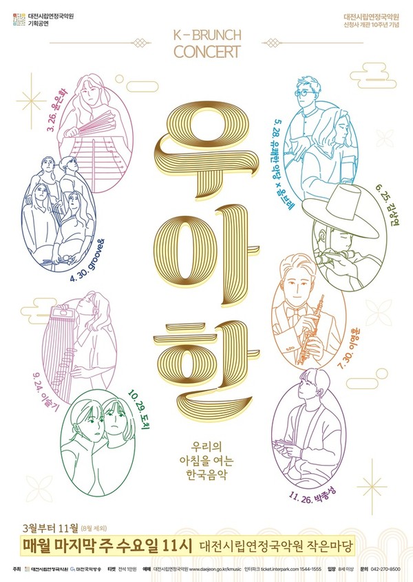 유한준 대전시립연정국악원 원장은“국악원 대표 프로그램으로 자리매김한 <K-브런치콘서트 우·아·한>과 함께 동시대 최고의 아티스트들이 선사하는 한국창작 음악을 감상하는 뜻깊은 시간이 되길 바란다”라고 전했다.
