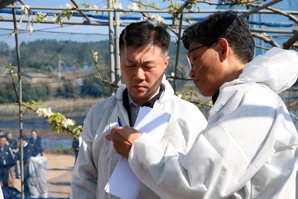 전라남도 나주시는 지난 15일 박범수 농림축산식품부 차관이 이상 저온 현상으로 인한 냉해 등 나주배 생육상태를 점검을 위해 농가 현장을 방문했다고 16일 밝혔다.