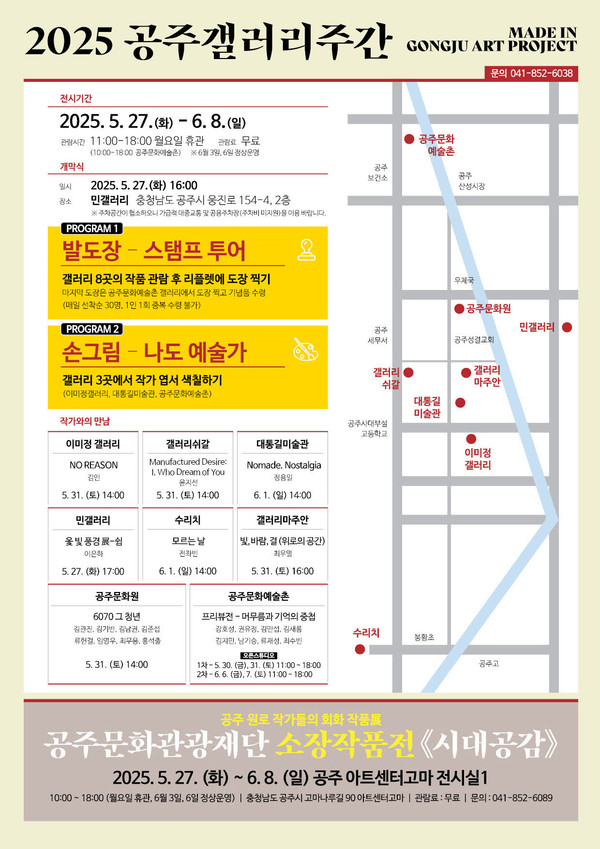 2025 공주갤러리주간은 오전 11시부터 오후 6시까지(월요일 휴관 / 6월 3일, 6월 6일 정상 운영) 시민 누구나 무료로 관람으로 전시를 함께 즐길 수 있으며, 개막식은 27일 오후 4시 민갤러리에서 열린다.