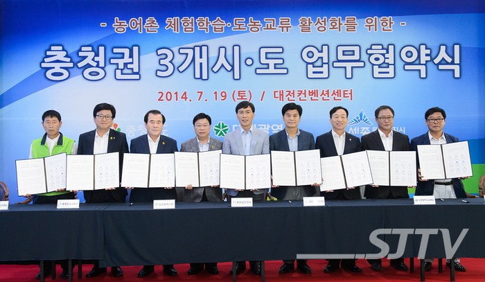 지난 19일 대전컨벤션센터에서 열린 ‘2014 세종·대전·충남 고향마실 페스티벌’ 개막식을 마치고 이춘희 세종시장(사진 오른쪽 4번째), 권선택 대전시장(6번째), 안희정 충남도지사(5번째) 등 3개 시도지사 및 교육감, 농촌체험휴양마을협의회 대표 등과 함께 농어촌체험학습․도농교류 활성화를 위한 업무협약을 체결했다