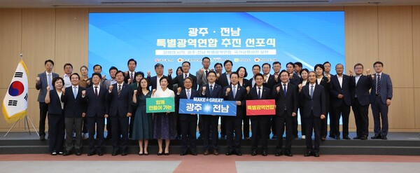 나주시청 대회의실에서 열린 ‘광주·전남 특별광역연합 추진 선포식’에는 김경수 지방시대위원장, 강기정 광주시장, 김영록 전남도지사, 윤병태 나주시장 등이 참석했다.