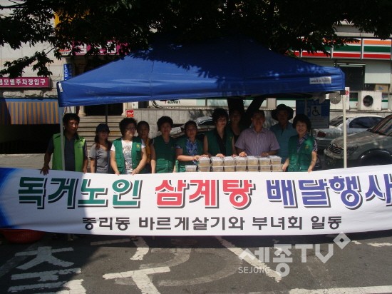 이날 두 단체 회원 30여명은 중리동(동장 김병식) 주민센터 앞마당에서 직접 삼계탕을 끓이고 포장하여 이를 조별로 나누어 배달함으로써, 노인들이 집에서 편히 보양식을 드실 수 있도록 하였다.