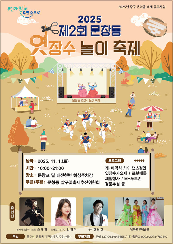 【SJB세종TV=박해연 기자】 대전 중구 문창동은 오는 1일 문창교 및 하상주차장 일원에서 ‘제2회 문창동 엿장수놀이 축제’를 개최한다고 밝혔다.