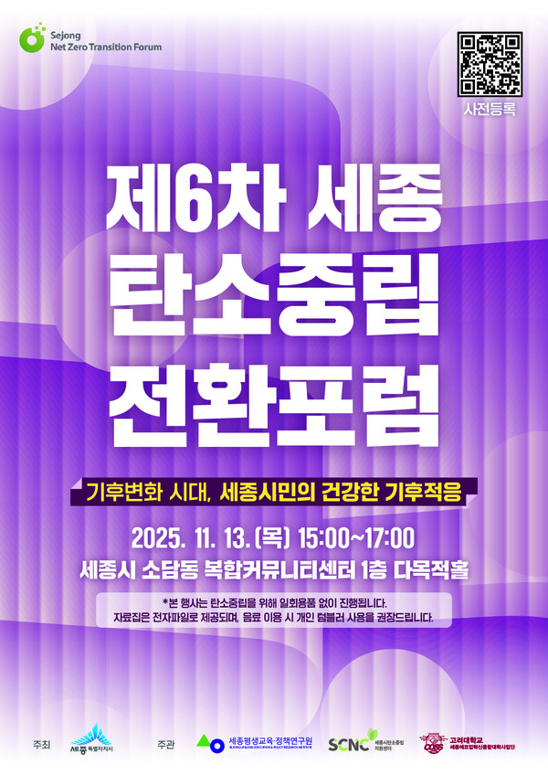 【SJB세종TV=경수진 기자】 세종특별자치시가 오는 13일 소담동 행복누림터 다목적홀에서 ‘제6차 세종탄소중립전환포럼’을 개최한다고 밝혔다.