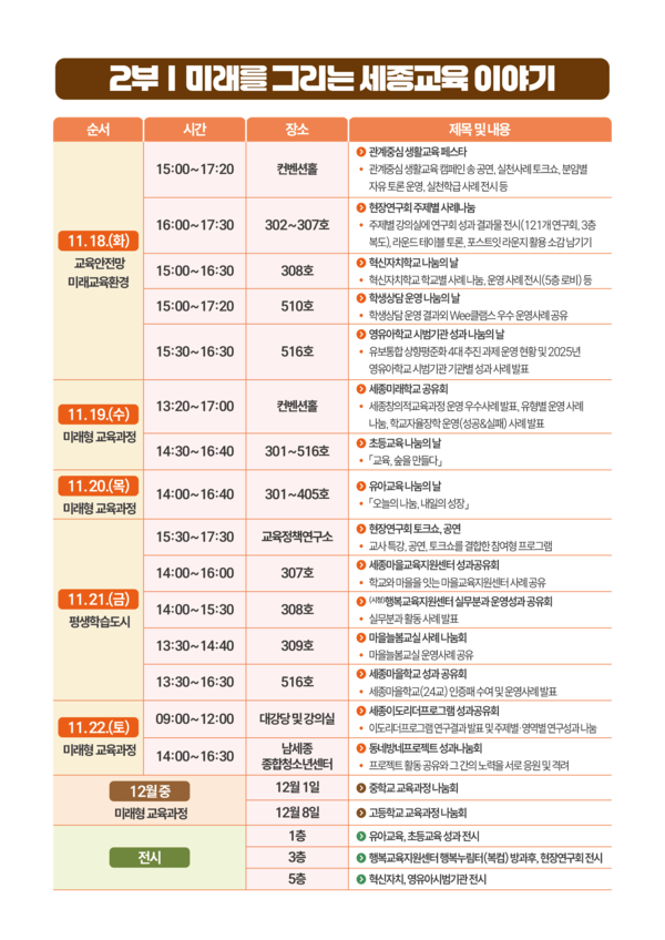 특히 교원, 학부모, 시민 등 교육공동체가 한자리에 모여 ‘모두가 특별해지는 세종교육’의 주요 성과를 돌아보고, 함께 성장하는 미래교육의 방향을 모색하는 공론의 장이 될 것으로 기대된다.