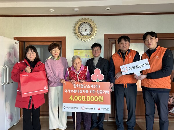 다양한 사회공헌으로 지역사회의 나눔문화를 선도하는 한화첨단소재는 올해 6월 호국보훈의달 맞이 보훈대상자 지원사업에 이어 연말에도 충남동부보훈지청과 연계하여 따뜻한 겨울을 보내실 수 있도록 물품을 전달하며 감사의 마음을 전했다.