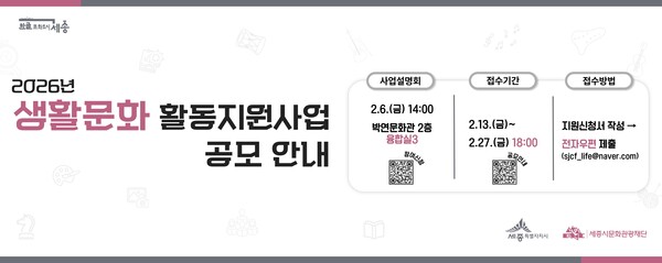 【SJB세종TV=송지민 기자】 세종시문화관광재단은 일상 속 시민 주도 생활문화 확산과 지역공동체 의식 강화를 위해 2026년 생활문화 활동지원사업 공모를 진행한다.