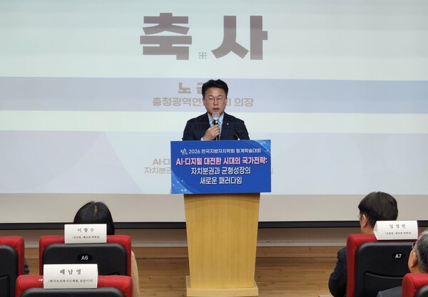 충청광역연합의회는 5일부터 이틀간 청주 오송에서 개최되는 ‘2026 한국지방자치학회 동계학술대회’에 참석했다. 노금식 의장은 축사를 통해 “충청광역연합은 대한민국 지방자치의 새로운 미래 모델을 개척하고 있다”며 “이번 학술적 논의를 밑거름 삼아 충청권의 상생 발전과 초광역 협력의 제도적 기반을 더욱 공고히 구축해 나갈 것”이라고 밝혔다.