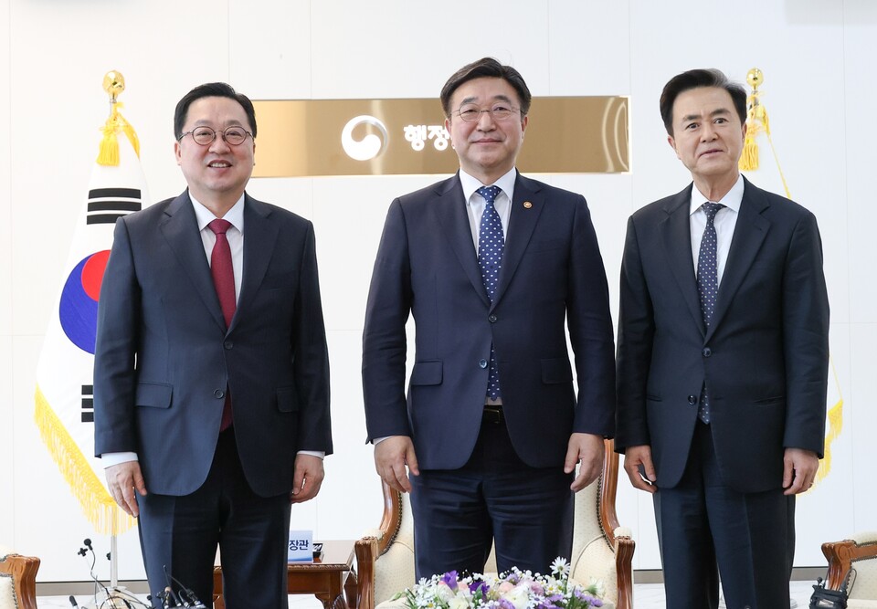 【SJB세종TV=황대혁기자】이장우 대전시장은 6일 오후 4시 정부세종청사에서 윤호중 행정안전부 장관, 김태흠 충남지사와 간담회를 갖고 대전․충남 행정통합 특별법의 원안 관철을 정부에 촉구하며 관련 건의문을 공식 전달했다.