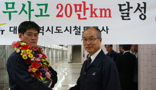 14일 대전도시철도공사에 따르면 승무팀 노우상(36)기관사가 지난 13일 20만97km 무사고 운전기록을 달성했다. 이날 오후 5시 노 기관사가 운전하는 열차가 판암역에 도착,기록을 달성하자 공사 박상덕 사장이 인증패와 화환을 전달하고 격려하는 조촐한 행사를 가졌다.