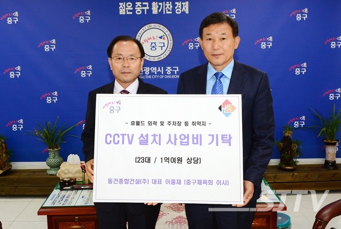 동건종합건설(주) 이흥재 대표(중구체육회 이사)는 22일 대전 중구(구청장 박용갑)를 방문하여 뿌리공원주변 안전사고 예방을 위한 안전용 CCTV 설치사업비 1억여원을 기탁했다.