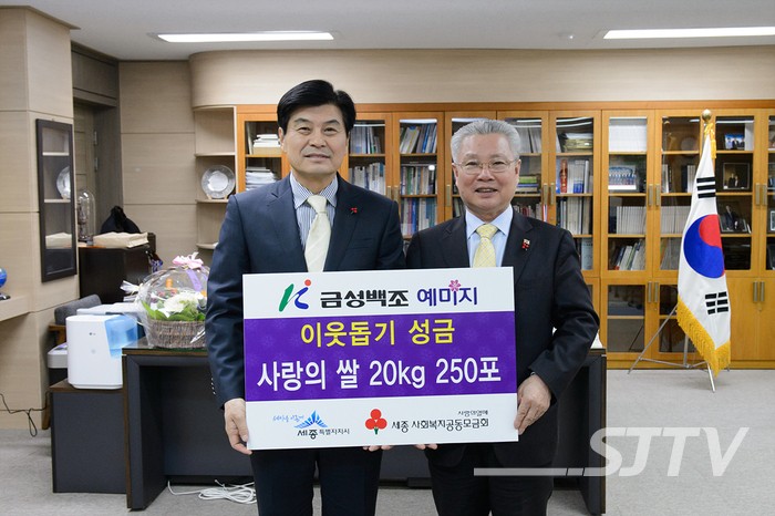 세종특별자치시(시장 이춘희, 이하 세종시) 신도시 건설에 참여하고 있는‘예미지’ 아파트 건설업체 ㈜금성백조주택 정성욱회장이 5일 지역의 어려운 이웃을 위해 사용해 달라며 쌀(20kg) 250포를 세종시에 기탁했다
