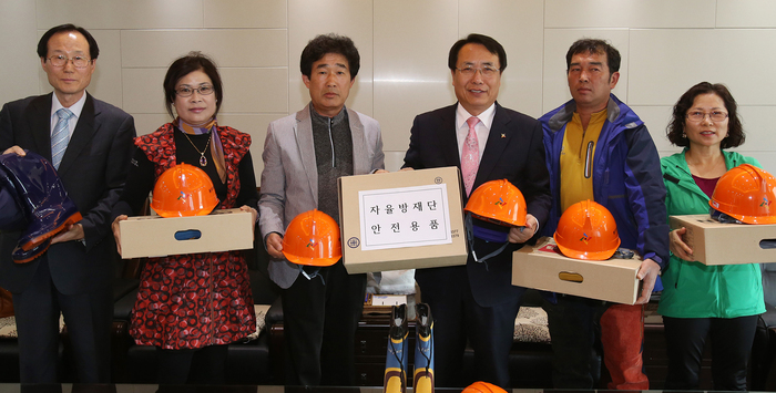 대전 동구(구청장 한현택)는 20일 방재활동 지원을 위한 안전모와 안전장화, 가슴장화 등 안전용품 100여점을 ‘동구지역 자율방재단(단장 김영호)’에게 전달했다.
