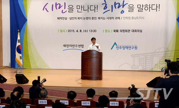 안희정 충청남도지사가 새정치민주연합 정책 엑스포 폐막 연설을 통해 “정치인들이 서로에 대한 비난과 반대에 머물지 말고, 미래에 대한 소망으로 경쟁하자”고 말하고, 진보와 보수 양진영이 20C 낡은 냉전 논리와 결별할 것을 제안했다.