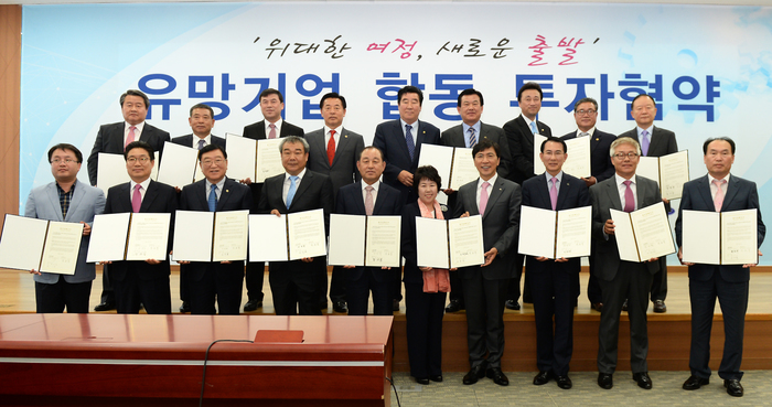 안희정 지사는 13일 도청 대회의실에서 오시덕 공주시장 등 7개 시·군 시장·군수, 조경희 ㈜바디프랜드 대표 등 12개 기업 대표이사와 함께 합동 투자협약(MOU)을 체결했다.