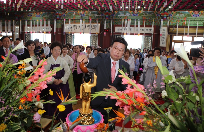 권선택 대전시장이 불기 2558년 부처님 오신 날을 맞아 25일 오전 유성구 광수사에서 열린 봉축 대법회에 참석해, 대전시민 모두의 건강과 안녕을 기원하며 아기부처를 목욕 시켜드리는 관불식을 거행하고 있다.