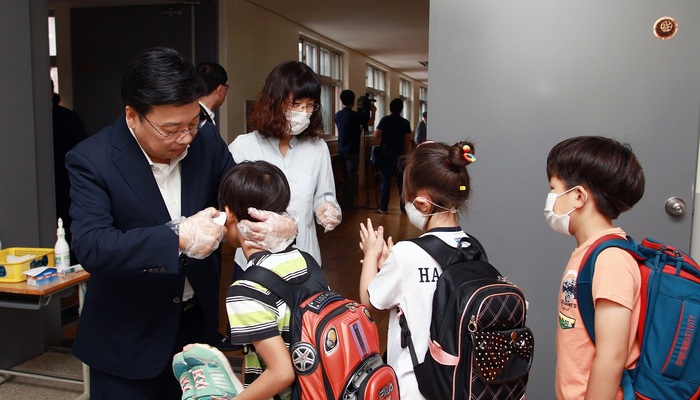권 시장은 이날 오전 8시 탄방초등학교에서 등교하는 학생들에게 직접 손소독제를 분사하고 체온계로 발열 여부를 체크하면서 개인 위생수칙 준수를 당부했다.