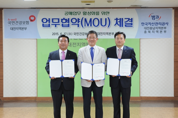 국민건강보험공단 대전지역본부(본부장 강희권)는 17일 4대 사회보험료 징수업무 협업을 위해 한국자산관리공사 대전충남지역본부(본부장 이종국), 충북지역본부(본부장 류재명)와 업무협약을 체결했다.